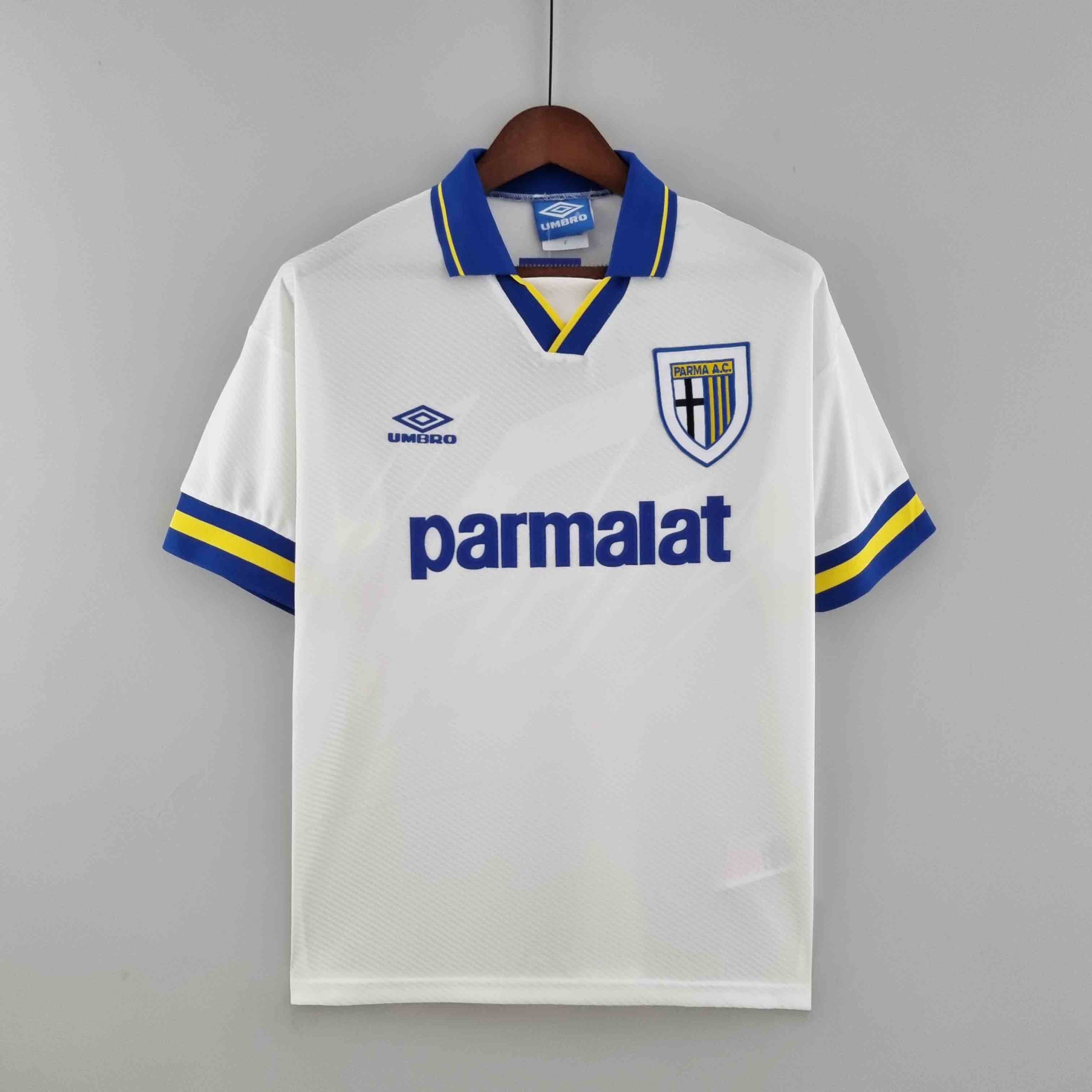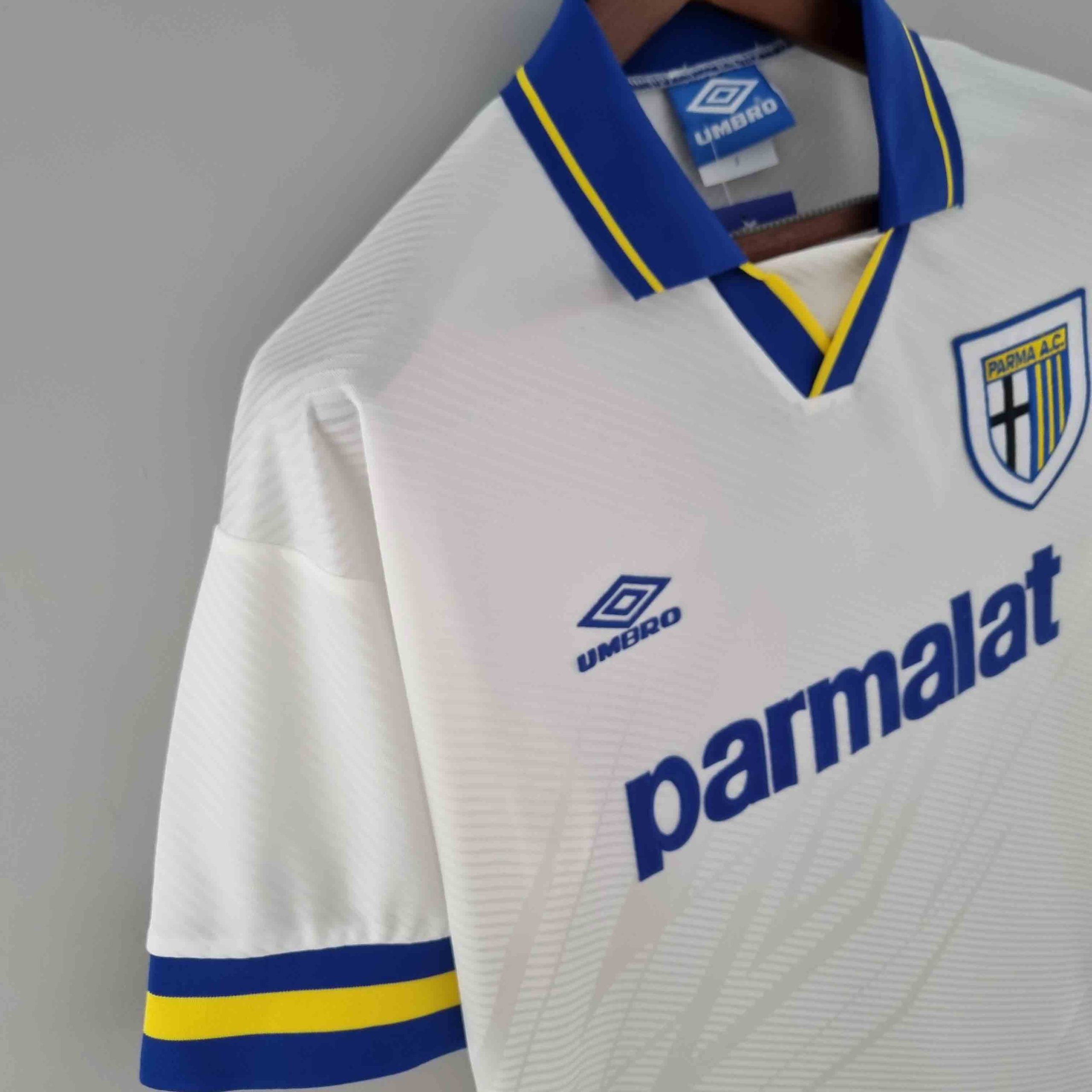 The Parma Away Jersey from 1993-1995 is a true classic from the golden era of Parma. This was the period when Parma established itself as a European powerhouse, competing at the highest level in both Serie A and continental competitions. Featuring legends such as Gianfranco Zola, Faustino Asprilla, Tomas Brolin, and Dino Baggio, Parma lifted the 1993 UEFA Super Cup, defeating AC Milan in a thrilling final. The elegant white away jersey with blue and yellow details became synonymous with Parma’s rise in European football. This was a time when the club was competing with Italy’s biggest teams, leaving a mark with their attractive style of play. RabonaJerseys.com guarantees top-tier quality with strict quality control, high-quality nameset printing, and authentic sleeve patches, ensuring an elite retro football experience.